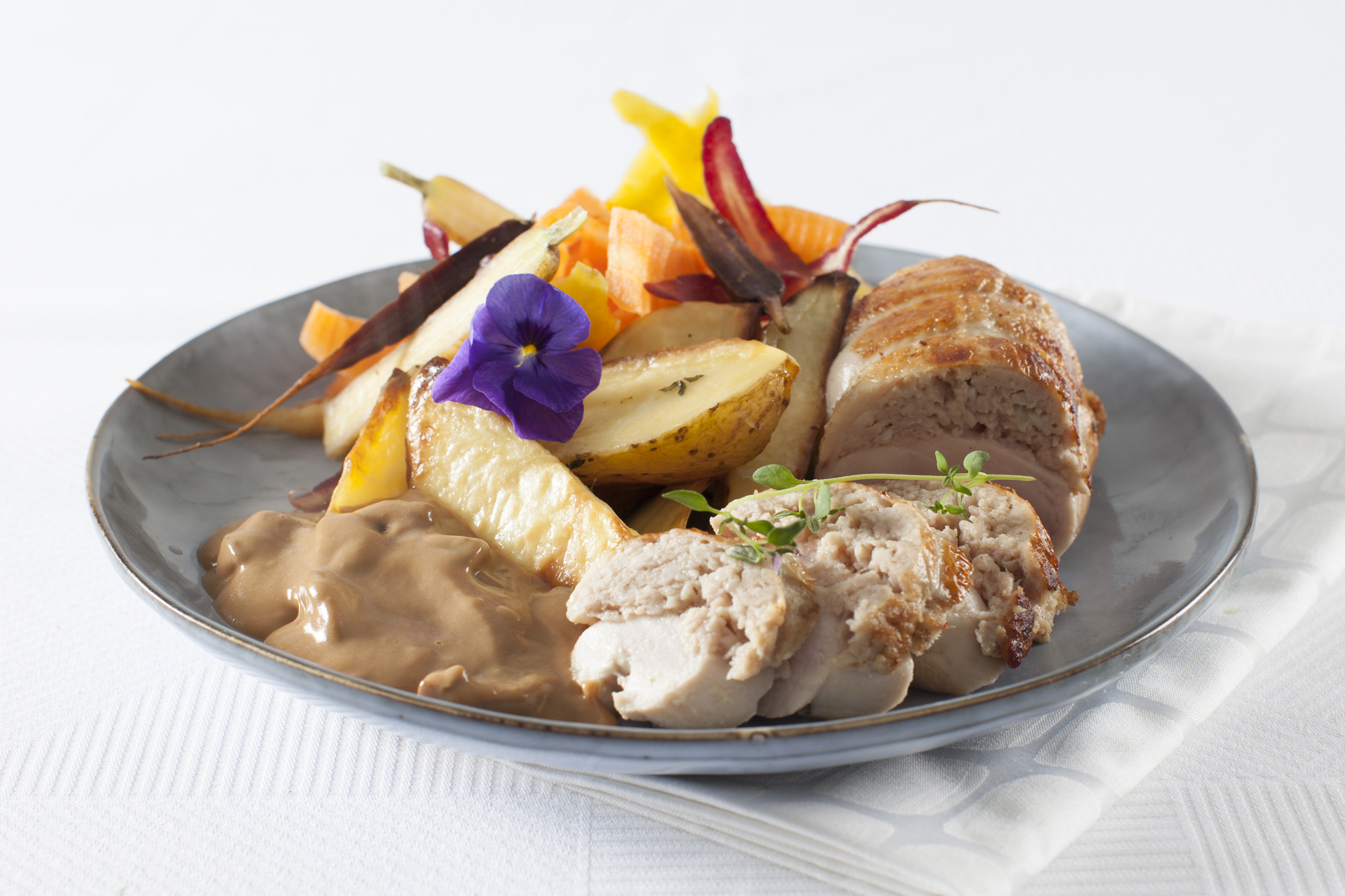 NB: Billedet viser et eksempel på sprængt kalkunbryst med tilbehør.