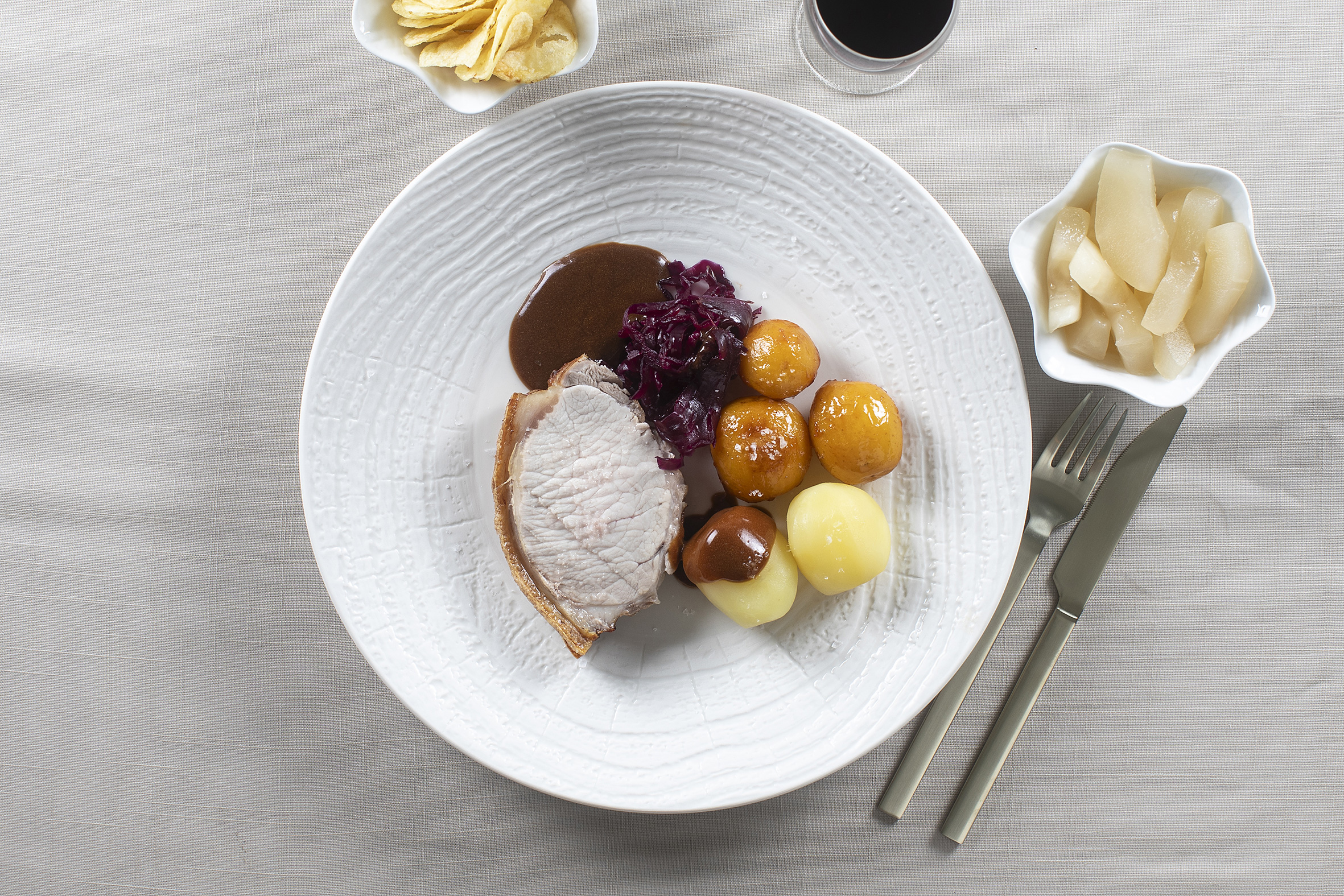 NB: Billedet viser et eksempel på flæskesteg med kartofler, brun sovs og rødkål.